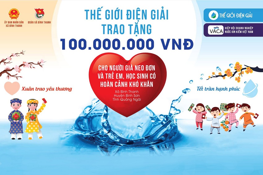 Nhằm chia sẻ khó khăn cũng như tạo điều kiện cho người già neo đơn và trẻ em có hoàn cảnh đặc biệt tại xã Bình Thanh, huyện Bình Sơn, Thành phố Quảng Ngãi đón một cái Tết ấm áp, hạnh phúc trong dịp Tết Tân Sửu này, Thế Giới Điện Giải đã phối hợp cùng Hiệp hội doanh nghiệp nước ion kiềm Việt Nam tổ chức và trao 100 suất quà Tết trong chương trình “Xuân trao yêu thương, Tết tràn hạnh phúc” vào sáng ngày 6/2/2022 vừa qua.